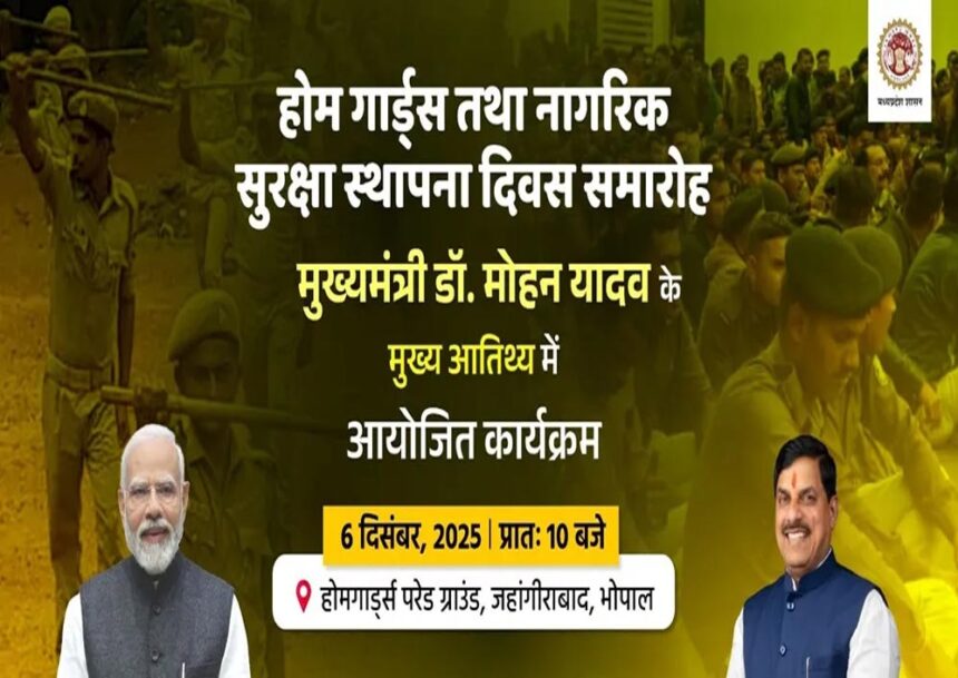 मध्यप्रदेश में होमगार्ड एवं नागरिक सुरक्षा संगठन का स्थापना दिवस 6 दिसंबर 2025 को पूरे उत्साह और सम्मान के साथ मनाया जाएगा। मुख्य कार्यक्रम का आयोजन जहांगीराबाद, भोपाल स्थित होमगार्ड्स परेड ग्राउंड में प्रातः 10 बजे से किया जाएगा, जिसमें प्रदेश के मुख्यमंत्री डॉ. मोहन यादव मुख्य अतिथि के रूप में शामिल होंगे। इस अवसर पर राज्य शासन के वरिष्ठ अधिकारी, जनप्रतिनिधि, गणमान्य नागरिक, सिविल डिफेंस वॉलंटियर्स, आपदा मित्र तथा बड़ी संख्या में होमगार्ड अधिकारी-सैनिक उपस्थित रहेंगे।