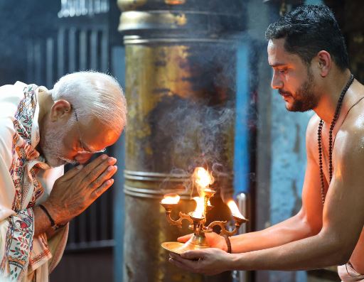 माना जाता है कि देवी कन्याकुमारी की मूर्ति की स्थापना 3000 साल पहले भगवान परशुराम ने की थी। पुजारियों ने बताया कि किसी प्रधानमंत्री ने पहली बार देवी के दर्शन किए हैं। धोती और सफेद शॉल ओढ़े मोदी ने मंदिर में पूजा-अर्चना की और गर्भगृह की परिक्रमा की। पुजारियों ने एक विशेष आरती की और उन्हें मंदिर का प्रसाद दिया गया जिसमें एक शॉल और मंदिर के देवता की फ्रेमयुक्त तस्वीर शामिल थी।जिसके बाद पीएम मोदी ध्यान लगाना शुरू करने से पहले, कुछ देर के लिए मंडप की ओर जाने वाली सीढ़ियों पर खड़े रहे।