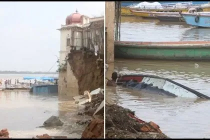Varanasi: कर्नाटक गेस्ट हाउस की दीवार गिरी, मलबा गिरने से गंगा में 30 फीट तक उछला पानी, क्षेत्र में फैली दहशत