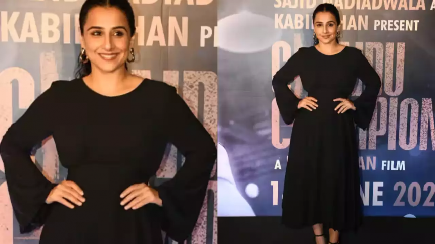 पॉपुलर अभिनेता कार्तिक आर्यन की फिल्म ‘चंदू चैम्पियन’ का प्रीमियर 13 जून को आयोजित किया गया था. इस इवेंट में विद्या बालन भी अपने भांजे के साथ फिल्म देखने पहुंचीं थी. एक्ट्रेस ने ब्लैक मिडी ड्रेस पहनी थी. जिसे उन्होंने ब्लैक हील्स के साथ पेयर किया हुआ था. पोनी टेल. गोल्डन हूप इयररिंग्स और मिनिमल मेकअप के साथ विद्या का लुक बेहद आकर्षक लग रहा था.